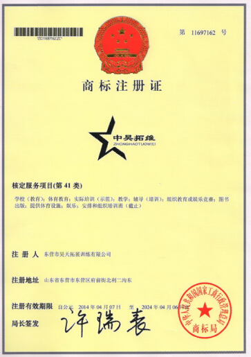 热烈恭贺东营市昊天拓展训练有限公司成功注册商标,并于2014年4月7日获得商标注册证。该商标有效期限为:2014年4月7日至2024年4月6日。